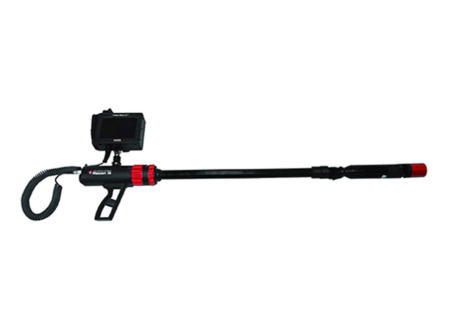 The Recon III utilizes a 240 degree articulating camera head with variable high output LED lighting to achieve effective visual searching as close as a few inches to over 10 feet (3m) in total darkness. The display is attached to the control housing with a quick connect fitting and can be easily removed to extend the cameras reach. Articulation is accomplished by rotating the large glove friendly drive collar. The pistol grip handle makes positioning and handling intuitive and provides an easy reference for camera head orientation. The lack of external wires and belt packs make the Recon III camera extremely maneuverable and portable.